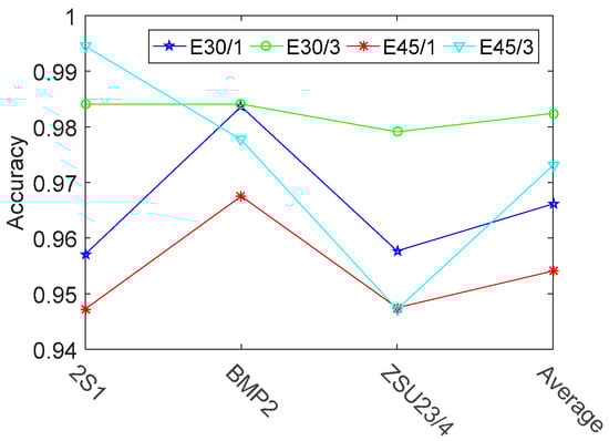 To assure the practicability of our method, the recognition performances under different depression angles are assessed. Three vehicle targets 2S1, BRDM2, and ZSU23/4 are utilized. The images captured at an operating condition of a 17° depression are used to train the algorithm, while the ones collected at an operating condition of 30° and 45° depressions are used for testing, as shown in Table 6.
