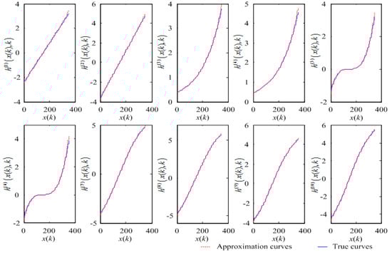 Because the state x ( k ) ranges from –3 to 4, we chose S = 10 sampling points ( x i = 4 , 3 , , 5 ) to approximate, and the corresponding coefficients were γ = 1 , Δ x i = 1 , and n = 2 . Their mean square errors (MSEs) are shown in Table 1, and the approximation curves are shown in Figure 2.