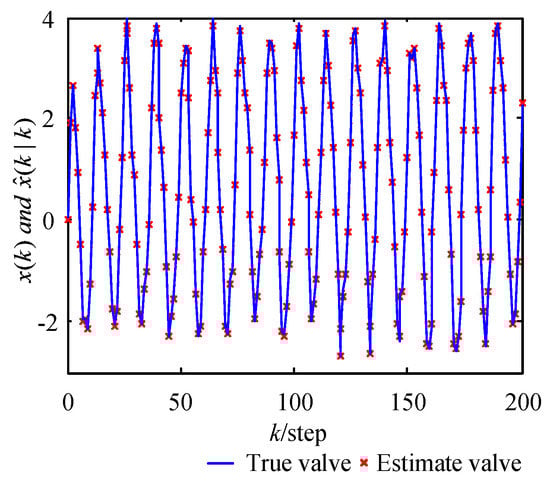 Using the WMF-PF algorithm, we obtained the state estimate for the system in Equations (39) and (40). The curves of the true values and their estimates, using WMF-PF based on Gauss–Hermite approximation, are shown in Figure 3. The tracking performance is optimal.