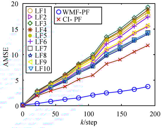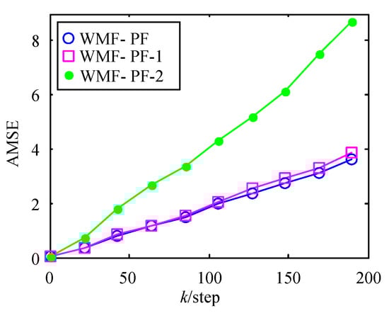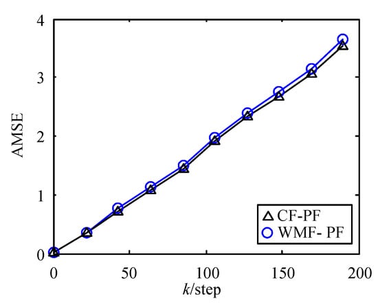 In addition, we simulated the AMSE curves of WMF-PF under S = 8 , x i = 3.6 , 2.4 , , 4.8 , Δ x i = 1.2 , n = 2 , and γ = 1 and WMF-PF under S = 10 , Δ x i = 1 , n = 2 , and γ = 0.9 . To distinguish them with the above WMF-PF, we named them WMF-PF-1 and WMF-PF-2. The AMSE curves of WMF-PF, WMF-PF-1, and WMF-PF-2 are shown in Figure 5. We can see that, as the interval Δ x i becomes larger, the computational cost is reduced, but the estimation accuracy declines, and a reasonable parameter γ can improve the estimation accuracy. The AMSE curves of WMF-PF and CF-PF are shown in Figure 6. We can see that the accuracy of WMF-PF approximates that of CF-PF.