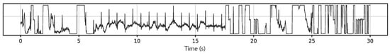 Example excerpt of the signal used, acquired on the steering wheel whilst driving. It is relevant to remark the evident and unprecedented predominance of noise over the signal, especially the effect of varying impedance denoted by the frequent saturation periods, which pose significant threats to the reliability of the recognition process.