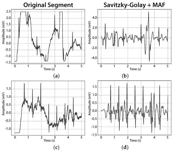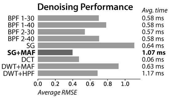 The proposed combination of Savitzky-Golay with a moving average filter (SG + MAF) had its performance compared with the most successful prior art methods: bandpass filters (BPF) with bands 1–40 Hz [,,], 2–40 Hz [,], 1–30 Hz [], and 2–30 Hz [,]; Savitzky-Golay (SG) []; Discrete Cosine Transform (DCT) []; and the combinations of Discrete Wavelet Transform with a moving average filter (DWT + MAF) [] and with a highpass filter (DWT + HPF) [].