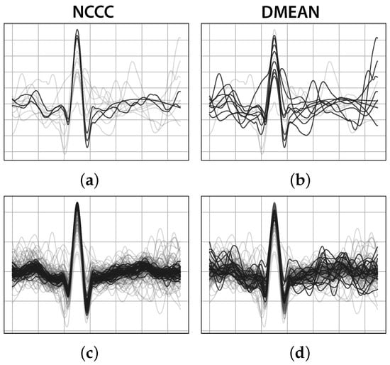 Comparison between DMEAN and NCCC, the proposed approach for outlier detection and removal, with two example template sets (first row: first template set with NCCC (a) and DMEAN (b); second row: second template set with NCCC (c) and DMEAN (d); dark lines: Selected heartbeats; light grey lines: Templates rejected as outliers).