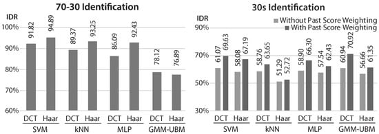 Identification rate (IDR, accuracy) results of the proposed method in identification tasks (left: Results with 70-30 dataset split; right: Results with 30 s train, with and without past score weighting).