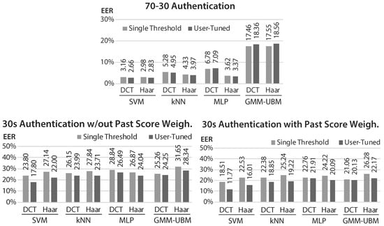 Equal error rate (EER) results of the proposed method in authentication tasks, with and without user-tuned thresholds (top: results with 70-30 dataset split; bottom-left: results with 30 s train; bottom-right: results with 30 s train and past score weighting).