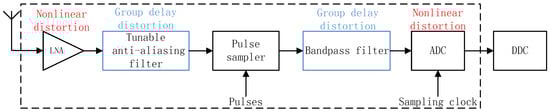 It is worth noting that, except for the heterodyne receiver shown in Figure 1, zero-IF and low-IF receivers are also in general use in sensors. However, no matter which kind the receiver belongs to, the joint effect of the non-constant group delay distortion and nonlinear distortion could occur in the receiver. Strictly speaking, an ideal linearity condition is hardly met in a real RF front-end. Almost every part in a receiver, such as the LNA, mixer, BPF, and ADC, can generate nonlinear components. Moreover, as long as the RF front-end has a broad passband, group delay is supposed to vary in a large range that cannot be ignored and, especially, the BPF’s nonlinear phase-frequency response and the nonlinear device’s memory effect will both make it happen. Thus, in the actual receiver system, the joint effect certainly exists and becomes more complicated.