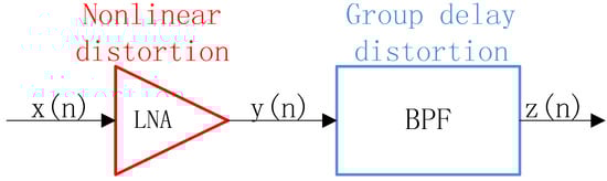 According to Figure 1, the proposed method is expected to focus on baseband signals after the RF front-end and DDC. In order to see how a non-constant group delay in the passband influences the signals with nonlinearity, a simplified grey-box model containing the LNA and band-pass filter (BPF) in series is built in Figure 2. When passing through the receive chain, signals are distorted. Even though all kinds of modules with non-ideal linear characteristics in the RF front-end could bring in nonlinearity and non-constant group delay, we should pay attention to the main influence and make the following assumptions that the main source where nonlinearities are generated is at the LNA stage, and non-constant group delay distortion in the passband is due to the non-ideal phase-frequency response of the BPF.