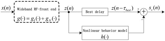 The scheme for nonlinearity cancellation is presented in Figure 3, where is assumed as the transfer function of a broadband RF front-end including the linear term with memory and the nonlinear term with memory . Hence: