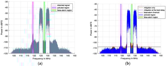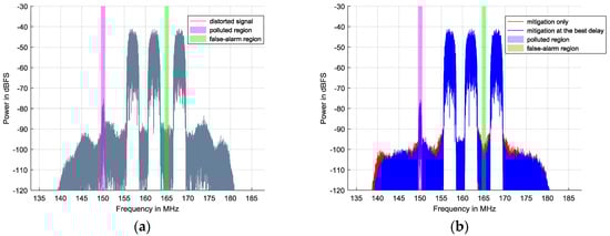 The simulation signals are comprised of two strong 16 Quadrature Amplitude modulation (16QAM) signals and a weak one. Both of the strong signals are generated with the same amplitude of −45 dBFS and the same symbol rate of 2 MHz. Their center frequencies are 125 MHz and 130 MHz, respectively. The weak one located in the polluted region is at 119 MHz with −97 dBFS, and its symbol rate is 0.5 MHz. Their baseband signals are obtained by carrying out DDC. Hence, from the distorted spectrum in Figure 5a, unwanted nonlinearities cover the weak 16QAM’s spectrum and distort it seriously so that its signal to interference plus noise ratio (SINR) inevitably decreases. In addition, the green region affected by intermodulation is originally supposed to be a vacant spectrum. Therefore, false-alarm probability in this region rises and spectrum efficiency degrades.