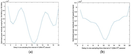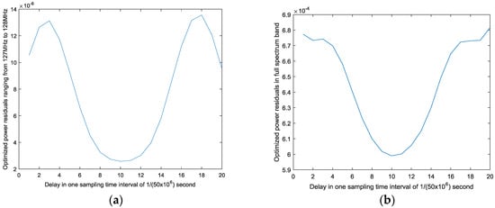 Relationships between delay and power residuals after optimization: (a) the optimized power residuals in the false-alarm region; and (b) the optimized power residuals in the full-spectrum band.