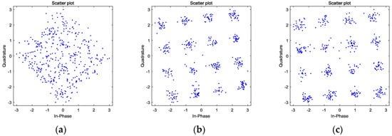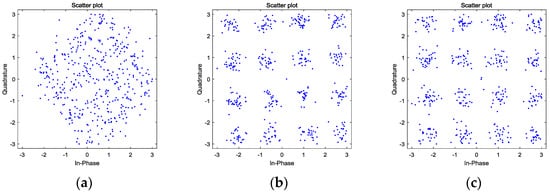 The constellations of the 16QAM signals in the polluted regions: (a) distorted weak 16QAM; (b) weak 16QAM after mitigation without delay; and (c) weak 16QAM after mitigation at the best delay.