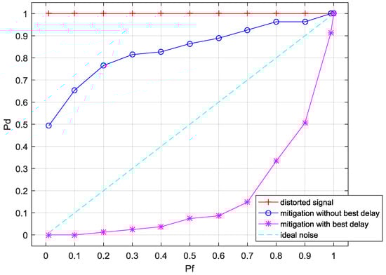As for the comparison between the mitigation method with and without best delay searching, the pure noise’s ROC is treated as a standard whose characteristic conforms to . Considering that the ROC curve here is in the false-alarm region, indicates the probability of detecting a nonexistent signal. For a fixed probability of , the blue curve’s is always greater than that of the pure noise, while the purple’s curve is always less. This is to say that, by the proposed best delay-based mitigation method, the sensor is less likely to detect a false signal. Consequently, we can draw the conclusion that nonlinearities can be mitigated more effectively when best delay searching is employed and, in that way, the reliability of spectrum sensing is enhanced.