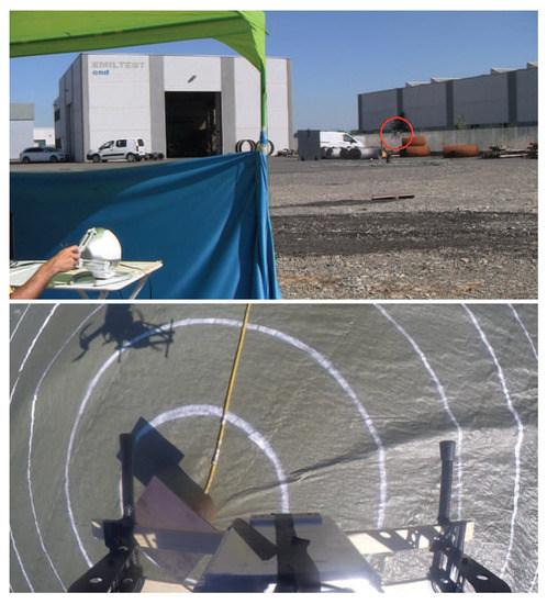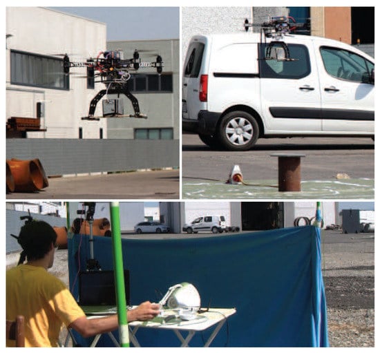 To improve accuracy in measuring the error between the location of the nuclear radiation source, estimated by the operator of the haptic device, and its actual location, a video camera was installed on the UAV, pointing to the ground, to record each experiment. Indeed, the recorded videos have been used offline to measure the error with a significantly better accuracy than using the GPS sensor. A set of experiments (five repetitions) has been performed to compare the two teleoperation modes described in Section 3.1. The location of the nuclear source was changed in each experiment, and it was unknown to the operator. Indeed, the operator was sitting in front of a cloth that prevented him from seeing the nuclear source on the ground. The operator was still able to see the UAV during the task. The nuclear source was placed at the center of a target with concentric circles (-m radius step size). Figure 12 shows images of the experiments. Again, each exploration experiment ended when the operator affirmed that the current position of maximum measured radiation was close enough to the nuclear source. On average, using the position to position teleoperation mode, the operator was able to detect the location of the nuclear source with a position error of m, while using the heading-based teleoperation mode, the position error was about m. The distance between the take-off position of the UAV and the location of the nuclear source was, on average, 20 m. The average flight time was 5 min. Experiments did not require any critical intervention by the operator of the remote controller.