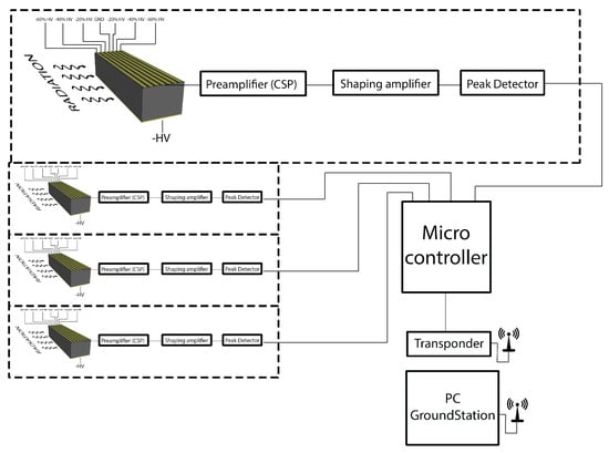 Four mm3 drift strip detectors were realized using CdZnTe material acquired from Redlen. Figure 4 shows the contact geometry of the anode and cathode contacts. The anode is realized with seven strips, the central being the collecting one, the adjacent strips are polarized in such a way to drift the carriers towards the collecting strip. Electroless gold contacts were used in order to obtain blocking contacts [41], and surface passivation was adopted to reduce the surface leakage current. Analog electronics were used to read out the generated signals, according to the scheme in Figure 5. The detector, the read out electronics, the batteries and the DC-DC circuit, which generates the high voltage supply, were stored in a box easily mounted on the UAV, as shown in Figure 3.