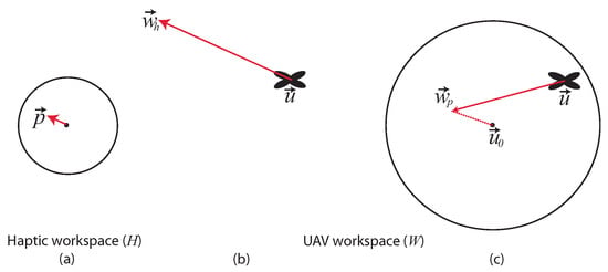 Diagram illustrating the two haptic teleoperation techniques. Haptic workspace on the plane (a). Heading-based control technique (b); the current displacement of the haptic device is used to compute a heading direction with respect to the current UAV position. Position to position control technique (c); is used to compute a waypoint with respect to the center of operation .