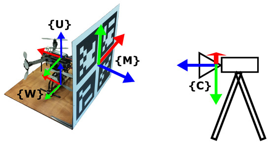 The current 3D position of the UAV in the camera reference frame C is given by , where is the current 3D position of the UAV in the world reference frame W (located at the base of the takeoff platform) provided by the autopilot extended Kalman filter (EKF). The EKF fuses data from the GPS sensor, IMU and barometric altimeter, and therefore, it is strongly affected by the position error of the GPS receiver. is a fixed transformation between W and the marker reference frame M, and is the transformation of the marker as seen from the camera reference frame.