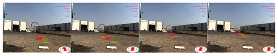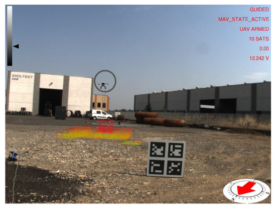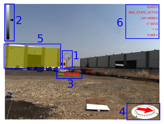 The current UAV heading and magnetic north are displayed on a virtual compass (Widget 4). Geographical features in close proximity to the UAV workspace are retrieved from a query to the Open Street Map (OSM) database, registered in the augmented reality scene and highlighted on the screen (Widget 5) when the UAV flies close to them. Each building is displayed by computing an oriented bounding box from a 2D polyline provided by the geographical data. Buildings are also used to generate geo-fences for the UAV, i.e., a virtual perimeter for collision avoidance. Automatic registration only provides a coarse alignment of the geographical elements due to calibration errors and imprecisions in the OSM data. Hence, registration is manually refined during the calibration phase. More advanced approaches for automatic registration of buildings could be adopted [43,44,45]. However, these methods are beyond the scope of this work. Buildings are displayed using yellow color. Since OSM does not provide information about buildings’ height, the height is fixed to a constant value. The last graphical overlay (Widget 6) provides textual information to the operator about mission-critical parameters including current flight mode, flight status, horizontal dilution of precision (HDOP) and number of satellites currently visible.