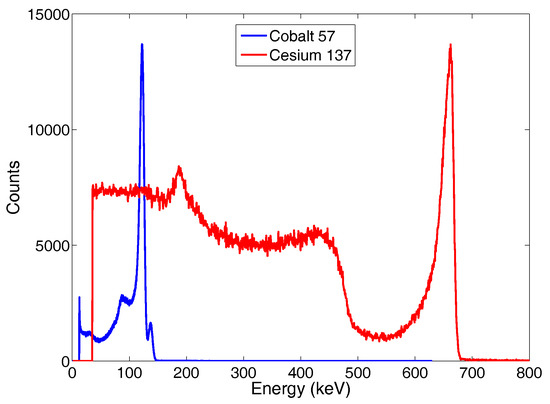137Cs and 57Co emission spectra as measured by the detector and the electronic mounted on the UAV in an indoor laboratory setup.