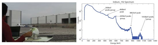 A first experiment has been performed in heading-based teleoperation mode with prior knowledge of the location of the nuclear source, which was placed in direct sight of the operator. Figure 10 shows an image of the experiment, with the UAV close to the radiating source, as well as the corresponding total accumulated spectrum. The acquired energy spectra reveals all of the main emission peaks of 192Ir, allowing a definitive identification of the emitting nuclear source. Figure 11 shows the total flight path of the UAV. The flight time of the experiment was about 7 min. In this experiment, the error between the actual position of the nuclear source and the location of the maximum measured radiation intensity was about m (estimated using GPS coordinates).