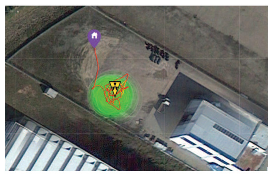 Detection of 192Ir in the real environment (the operator has direct sight of the nuclear source): flight path of the experiment shown in Figure 10; regions where radiation was measured by the CdZnTe detector (green circles with different sizes and shading) and the estimated location of the maximum radiation (apex of the yellow triangle).