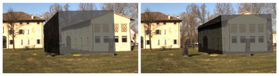 Building visualization in augmented reality: result from coarse registration (left) and after manual correction (right).