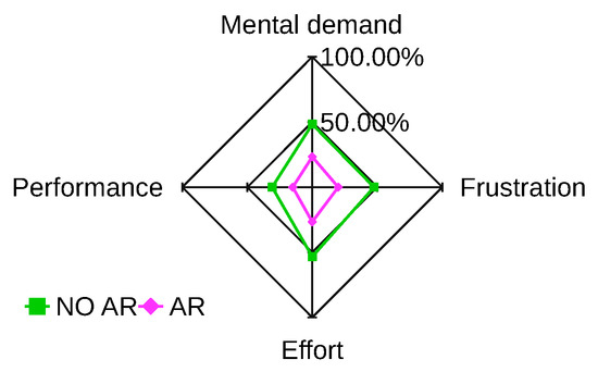 NASA-TLX questionnaire results. The AR line indicates average results of the VHAR interface; the NO AR line indicates average results without visual-feedback.