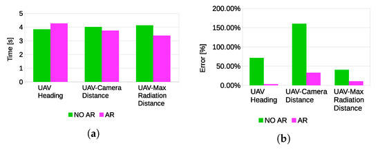Participant were asked questions during the execution of the task according to the SPAM method. Questions were related to the current state of the task. In particular, three questions were asked: “What is the current heading of the UAV with respect to the magnetic north?”, “How far is the UAV from the current location of maximum radiation?”, “How far is the UAV from the camera?”. Participants explicitly stated that the visual feedback of the VHAR interface was very useful to detect the nuclear radiation source and to determine distances. Indeed, statistically-significant results (Figure 20) were found for all of the parameters estimated by the users (). However, the results of the questionnaire indicated no significant differences in response time. Hence, it can be concluded that the main advantage of adding visual feedback is that it can improve the situation awareness of the task. Furthermore, the results indicate that adding visual feedback did not provide a significant improvement in position detection accuracy of the nuclear source.
