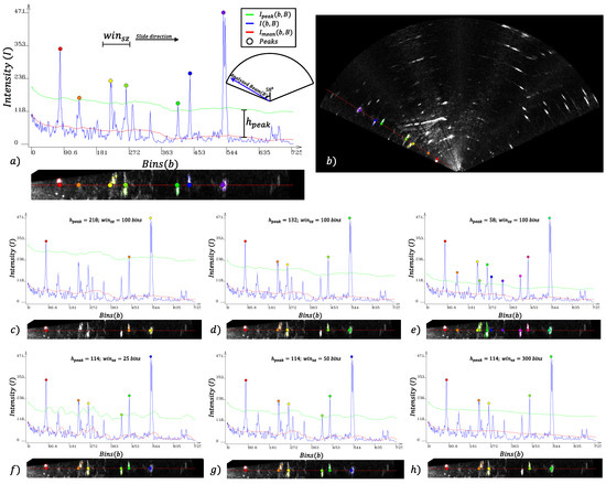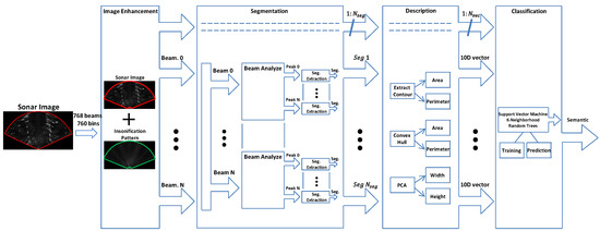 12], with modifications on the segmentation methodology. Now, the local parameter adjustment averages a window of bins in order to find peaks of intensities. These peaks define each local threshold parameter in the segmentation process. In addition, an extended study of the classification algorithms applied to acoustic images is presented, where the Support Vector Machine, Random Trees, and K-Nearest Neighbor classifiers were evaluated.