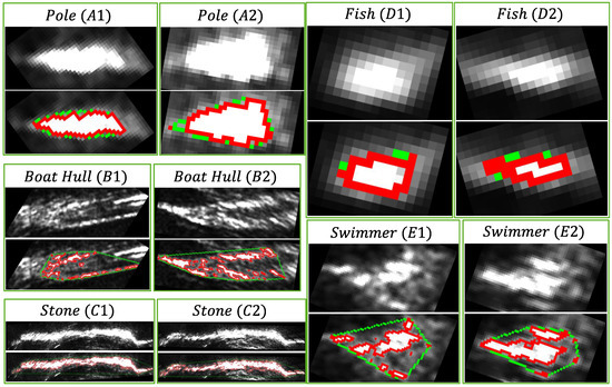 Figure 1 shows an example of the semantic information that can be obtained by the approach. The acoustic images are segmented and their shapes are described geometrically. Then, they are classified into five different classes (Pole, Boat Hull, Stone, Fish and Swimmer) using a tool developed to annotate the sonar data. The annotated data allow the training of supervised classifiers and all created datasets and developed code are made available. The code is available at [