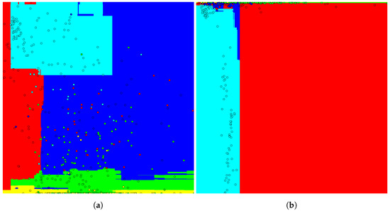 Because it is a 2D space, an image representing the classification space for the best and the worst feature combination can be generated. The images are shown in