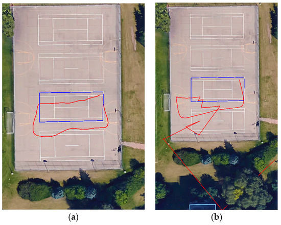Figure 1 illustrates the accuracy of the GPS chipset embedded in the iPhone 6 for a known shape. The blue color trajectory represents the reference trajectory of a tennis court and the red color is the GPS solution. Two tests were collected over the same trajectory with a short time difference between them. As shown in Table 1, the total distance error in the second test was not acceptable for both navigation and mapping applications, while the total distance error in the first test is within the expected accuracy of the GPS single point positioning solution. These tests clearly show the challenge associated that can be faced when relying only on smartphone’s GPS chipset for mapping applications. Therefore, the objective of this paper was to use any smartphone as a MMS by overcoming the GPS limitation and the IMU drift issue associated with most smartphones.