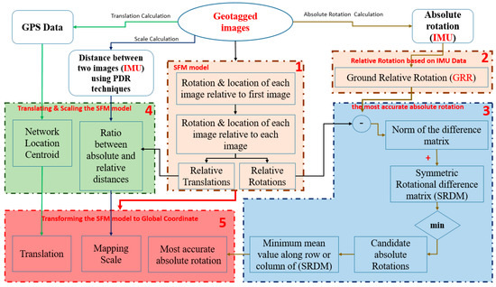 As illustrated in Figure 3, the methodologies begin by estimating the relative orientations (RO) w.r.t the first image using Structure from Motion (SfM), which provides an up-to-scale 3D model. Thus, the initial EOPs acquired by smartphone sensors are used to calculate global relative rotations (GRR) between each paired images. Then, each GRR is subtracted from the corresponding rotation acquired by the SfM; and the norm of each difference is used to build symmetric rotational difference matrix. The two corresponding relative rotations which have a close to zero difference are corresponding to the most accurate IMU measurements that associated with two images in the network. The accuracy of these two candidate absolute rotations is further examined where the most accurate one is then used to rotate the SfM model to the mapping coordinate frame while the absolute scale is determined using the ratio distance between two images, the relative distance is acquired by the SfM, and absolute distance obtained using pedestrian navigation techniques (e.g., steps detection).Also, the centroid of all the GPS locations associated with all images are calculated and used to translate the SfM model to the global coordinate. Once the initial EOPs are refined then these EOPs, along with geometric constraints, are entered into a free network bundle adjustment algorithm for reconstructing robust 3D objects. These steps are explained in details in the following subsections.