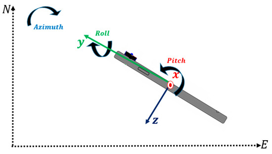 These Euler angles are used to compute the rotation matrix , which rotate the motion sensors measurements from the IMU (body) frame to the Global frame as expressed by Equation (1):