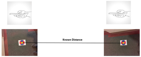 Two color coded targets are placed on ground with a 7.22 m distance between them. The diameter () of each target is at 20 cm. At each validation experiment, the user is asked to capture two images, one for the first target and another for the second target, as shown in Figure 8. Then, a morphological image classification technique is used to extract the centroid and the diameter () of each target, whereby the scale () is determined by the ratio between the actual target diameter and the image diameter of the same target. The shift between the centroid of each target and the camera perspective center position at the time of exposure then are calculated using Equation (10):