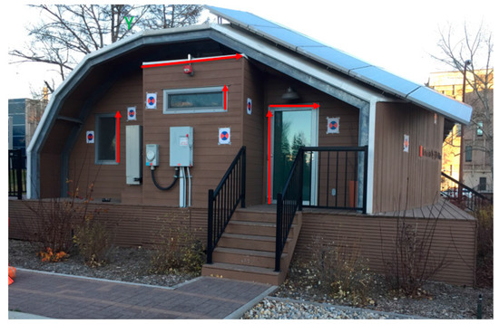 Although, the initial EOPs were corrected using the proposed relative orientation, they still contained some errors due to the uncertainty of the scale automatic determination and the low-cost sensor errors. Therefore, the corrected initial EOPs and OPs became the input to the free network adjustment; and all the selected OPs were included in the inner constraints matrix to fix the network as illustrated in Figure 13. Moreover, three vertical and three horizontal linear features were visible in most of the captured images and distributed in different locations around the object, which were chosen to improve the final solution as illustrated in Figure 13.