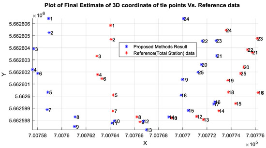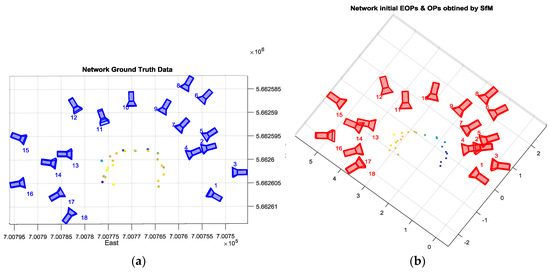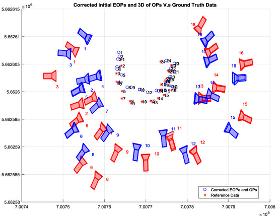 The initial EOPs and OPs were determined using the SfM algorithm, which provided a good shape for the network compared to the ground data collected using Total Station as shown in Figure 10, but these initial parameters were in an arbitrary frame of coordinates. Therefore, this result needed to be scaled, rotated, and shifted to the global coordinate as discussed in the proposed method.