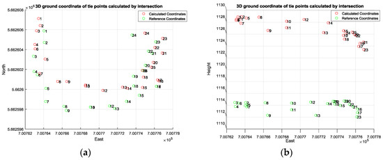 Then, the well-known intersection method was conducted to calculate the 3D coordinates of the desired tie points utilizing the image measurements and the corrected initial EOPs of the involved camera stations as illustrated in Figure 12a,b.