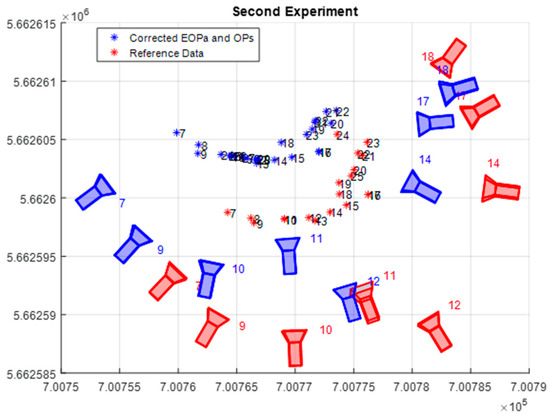 First the scale was determined using the distance between two successive images; then, the SfM model was rotated using the most accurate IMU data corresponding to one of the images. Finally, the GPS centroid was utilized to translate the network. The results of the transformation process and the corrected initial EOPs are illustrated in Figure 11.