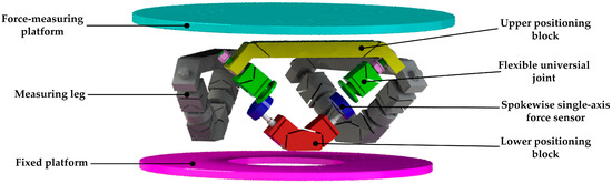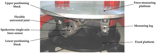 Compared with the traditional multi-axis force sensor, the sensor with flexible joints has advantages of fast response, small accumulated error, no mechanical friction and high measurement accuracy, so it has broad application prospects [1,2,3,4,5]. At present, the design of sensors with flexible joints can be divided into two categories: the majority of sensors are designed and processed based on the integral structure. The other is using the assembled structure. For the former, there have been numerous research achievements. Kerr [6] proposed that the Stewart platform with instrumented elastic legs can be used as a six-axis force sensor. Gao et al. [7] developed a six-axis controller based on the Stewart platform-based force sensor, and introduced the use of elastic joints to replace the real spherical joints which made miniaturization possible. Liang et al. [8] designed and developed a new six-axis sensor system with a compact monolithic elastic element, which detected the tangential cutting forces along the x-, y-, and z-axes as well as the cutting torques about the x-, y-, and z-axes simultaneously. Unfortunately, restricted by their integrated structure, most of the sensors mentioned above are used in a small range of applications. In addition, the main error source of these sensors is deformation error. As for the latter assembled by flexible kinematic joints, Yang [9] developed a planar three-axis force sensor with flexible joints to diagnose and monitor bearing faults online in real time. Zhang [10] studied the model reconstruction theory of flexible assembly six-axis force sensors based on a hybrid leg spoke layout. Li [11] established an integral stiffness model of a flexible assembly six-axis force sensor based on the Stewart mechanism. These sensors are assembled traditionally. Consequently, the errors are mainly caused by the assembly process, which leads to large errors and low accuracy, so how to achieve high accuracy while taking into account a large measurement range is still a challenging problem. At present, there is limited literature available on this issue. Zhao et al. [12] proposed a large measurement range flexible joints six-axis sensor. Its mathematical modeling and calibration experiments were performed.