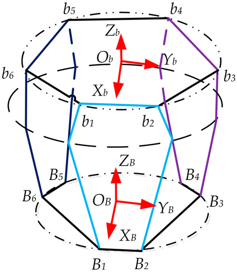 stands for center point of the first revolute joint axis on the lower positioning block, which is adjacent to the fixed platform. These six points can theoretically compose a planar hexagon. A fixed coordinate frame named is attached to the geometric center point of the hexagon. The -axis is arranged on the normal direction of the fixed base plane; the -axis is perpendicular to connection between two points and ; the -axis is determined by the right-hand rule. Similarly, stands for center point of the revolute joint axis on the upper positioning block, and a moving coordinate frame is established.
