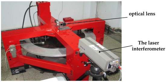 Based on the loading location of force and torque mentioned above, an optical lens is mounted on the measuring platform. The position of a laser interferometer is adjusted and then the deformation of the platform can be measured. The laser interferometer and optical lens installation location are shown in Figure 10 and Figure 11, respectively.