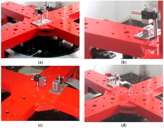 Optical lens installation measuring in six directions. (a) Linear displacement measurement along the -axis; (b) Linear displacement measurement along the -axis; (c) Pitching angle measurement around the -axis; (d) Swing angle measurement around the -axis.
