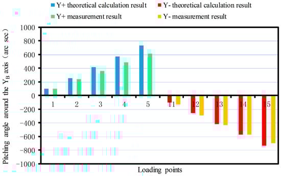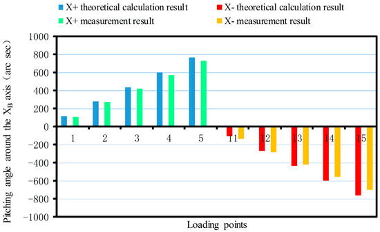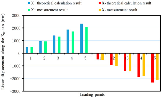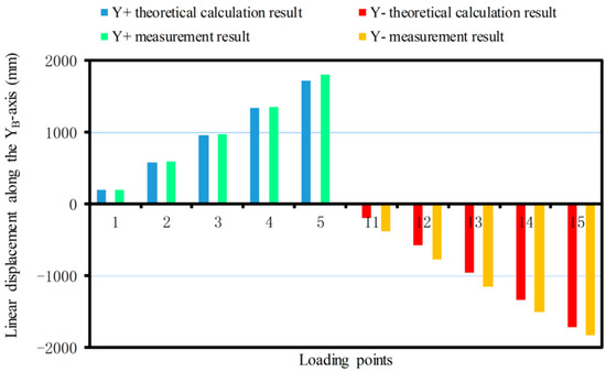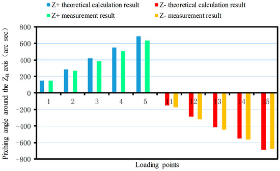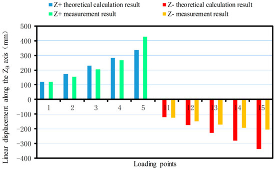 The linear displacement or pitching angle comparisons of the platform between the calibration deformation measurement results and the theoretical calculation results of the synthetic error are made as shown in Figure 12, Figure 13, Figure 14, Figure 15, Figure 16 and Figure 17.
