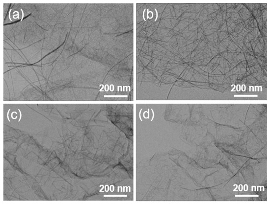 (a–d) TEM images of W18O49 NWs/rGO composites with different weight ratios. (a) 0.2%, (b) 0.5%, (c) 1%, (d) 1.5%.
