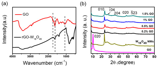 (a) FT-IR spectra of GO and 0.5 wt. % W18O49 NWs/rGO composite (b) XRD spectra of the GO, W18O49 NWs, and W18O49 NWs/rGO composites with different amount of rGO contents.