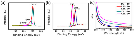 For the identification of changes in the functional groups, core level C 1s spectra are examined using X-ray photoelectron spectroscopy (XPS) analysis. The XPS spectrum of GO is presented in Figure S5, showing four different peaks at the position of 284.7, 286.9, 287.8, and 288.6 that belongs to the C–C/C=C, C-O, C=O, and O–C=O bonds, respectively [59,60]. After the accumulation of W18O49 NWs on rGO (Figure 3a), the C 1s XPS spectrum of composite shows an increase in intensity of C–C/C=C peak from 46.1% to 74.3% whereas the peak intensities of oxygen-containing functional groups are decreased, indicating the significant restoration of sp3/sp2-hybridized carbon structures [38]. The hydroxyl peak is observed in the spectrum of 0.5 wt. % W18O49 NWs/rGO composite at the position of 285.9, showing the same phenomena as reported before [61,62]. This generation of OH peak is due to the ring opening reaction of epoxides, commonly known as the reduction products of the oxygen-containing functional groups [38]. The high resolution spectra of W4f for 0.5 wt. % W18O49 NWs/rGO composite shows two peaks 35.7 and 38.1 eV that can be attributed to W4f7/2 and W4f5/2, respectively (Figure 3b) [55]. Moreover, the binding energies of W4f7/2 and W4f5/2 for the 0.5 wt. % W18O49 NWs/rGO composite are moved to lower values, indicating the interaction between W18O49 NWs and the rGO during the formation process of the W18O49 NWs/rGO composites [63].