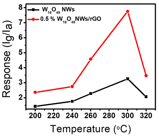 The UV–visible absorption spectra of pure W18O49 NWs and W18O49 NWs/rGO composites with different rGO contents (0.2, 0.5, 1, and 1.5 wt. %) are presented in Figure 3c. It was observed that by introducing different amount of graphene not only enhance the intensity of absorption but also shifted the light absorption range towards visible area [64]. The Brunauer–Emmett–Teller (BET) measurements for the determination of surface area are presented in Figure S6a–c as surface area is a key factor for good efficiency of sensing materials. For the enhanced surface area measurement by the addition of GO, the specific surface area of pure W18O49 NWs and 0.5 wt. % W18O49 NWs/rGO composite were measured through the nitrogen adsorption–desorption tests. The BET surface area of pure W18O49 NWs and 0.5 wt. % W18O49 NWs/rGO composite was 72.843 m2/g and 81.843 m2/g, indicating the increase in surface area of 0.5 wt. % W18O49 NWs/rGO composite due to rGO addition. The gas detection applications were demonstrated by fabricating a number of gas sensor devices based on pure W18O49 NWs and W18O49 NWs/rGO composite comprising various amount of rGO ranging from 0.2 wt. % to 1.5 wt. %. The sensing behavior of most of metal oxide gas sensors is highly dependent on operating temperature. So at first, the temperature dependent gas sensing properties were investigated by operating gas sensors at different temperature and at a specific gas concentration. Figure 4 presents the gas sensing response of pure W18O49 NWs and 0.5 wt. % W18O49 NWs/rGO composite to 100 ppm toluene vapors as a function of operating temperature. The response of a sensor was defined in terms of current ratio (S = Ig/Ia, where Ig = sensor current in gas environment and Ia = sensor current in air). However, the sensing response factors such as response time and recovery time were calculated by time taken for the sensor to attain 90% of the total current change in the case of adsorption and desorption of gas, respectively. The increasing temperature resulted the increase in sensing response for 100 ppm toluene vapors and maximum sensing response for both pure W18O49 NWs and 0.5 wt. % W18O49 NWs/rGO composite to 100 ppm toluene vapors was observed at 300 °C. Afterwards, a gradual decline in response was obtained by increasing the temperature at 320 °C. Hence optimum working temperature for gas sensing measurements was selected at 300 °C. The increase in sensing response at higher temperature is due to enough thermal energy to react with the surface adsorbed oxygen species. Whereas, very high temperature results in a decrease in sensing response due to the difficulty in gas adsorption and low utilization rate of the sensing layer [65,66].