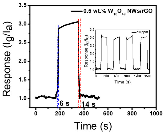 Response and recovery time measurement of sensor based on the 0.5 wt. % W18O49 NWs/rGO composite to 10 ppm toluene vapor at 300 °C. The inset is the repeatable response–recovery curves to 10 ppm toluene vapor at 300 °C.
