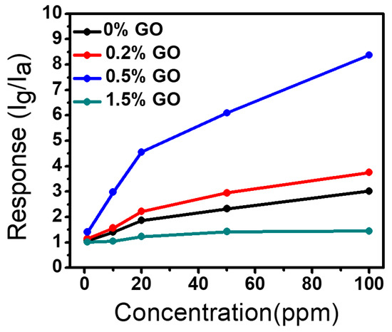 Figure 7 presents the linear relationship of sensing response of samples towards various toluene gas concentrations. The response of all samples increases almost linearly with increases in gas concentration and the linear response is observed above 20 ppm concentration. The detection limit of sensors is around 1 ppm with a sensing response of 1.06, 1.146, 1.404, and 1.011 for W18O49 NWs and W18O49 NWs/rGO composites (0.2, 0.5, and 1.5 wt. %), showing high response value of 0.5 wt. % W18O49 NWs/rGO composite. According to IUPAC definitions the signal can be true if the signal to noise ratio is higher than 3 [67], so the signal to noise ratio of 1 ppm data was measured which obtained around 7.305, showing the stability of signal at very low concentration. The response of pure W18O49 NWs, and W18O49 NWs/rGO composites (0.2, 0.5, and 1.5 wt. %) at 100 ppm toluene vapors are 3.02, 3.75, 8.375, and 1.447, respectively, showing a 2.8-fold increase in sensing response in case of 0.5 wt. % W18O49 NWs/rGO composite as compared to the pure W18O49 NWs.