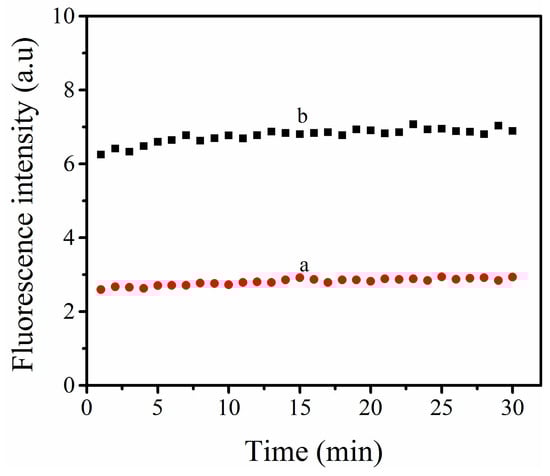 The fluorescence intensity of TPE-2N+ in Tris-HCl buffer was measured, the result indicated that under an excitation of 400 nm, the fluorogen gave an emission at 470 nm. The emission intensity was increased gradually with the increase of the fluorogen’s concentration (Figure 1A), and a linear relationship was obtained from 0 μM to 100 μM (Figure 1B). The stability of TPE fluorescence in Tris-HCl buffer was also examined, and a variation of TPE fluorescence intensity was measured over a time-period of 30 min. As shown in Figure 2, there is no obvious change in fluorescence intensity for the selected concentrations 5 μM and 50 μM of TPE-2N+ which suggested the TPE fluorogen had a favorable stability in Tris-HCl buffer.